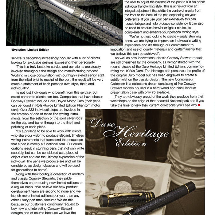 En plus des nouvelles innovations, les modèles classiques de Conway Stewart sont toujours chéris par l'entreprise, comme en témoigne la récente sortie de l'édition limitée Duro Heritage, commémorant les années 1920 Duro. Le stylo Heritage conserve le profil du modèle Duro original mais a été gravé pour créer une touche subtile au design classique. La nouvelle collection Connoisseur est le rêve d'un collectionneur composé de cinq modèles Conway Stewart logés dans un coffret de présentation en bois dur et laque noire avec seulement 75 disponibles.