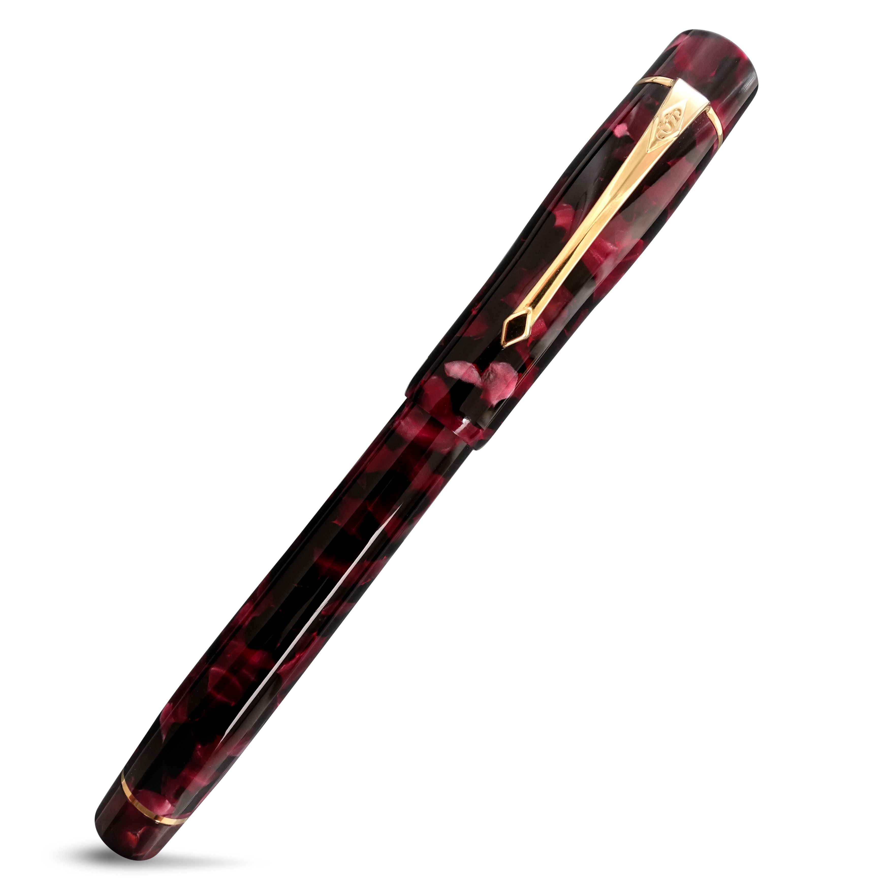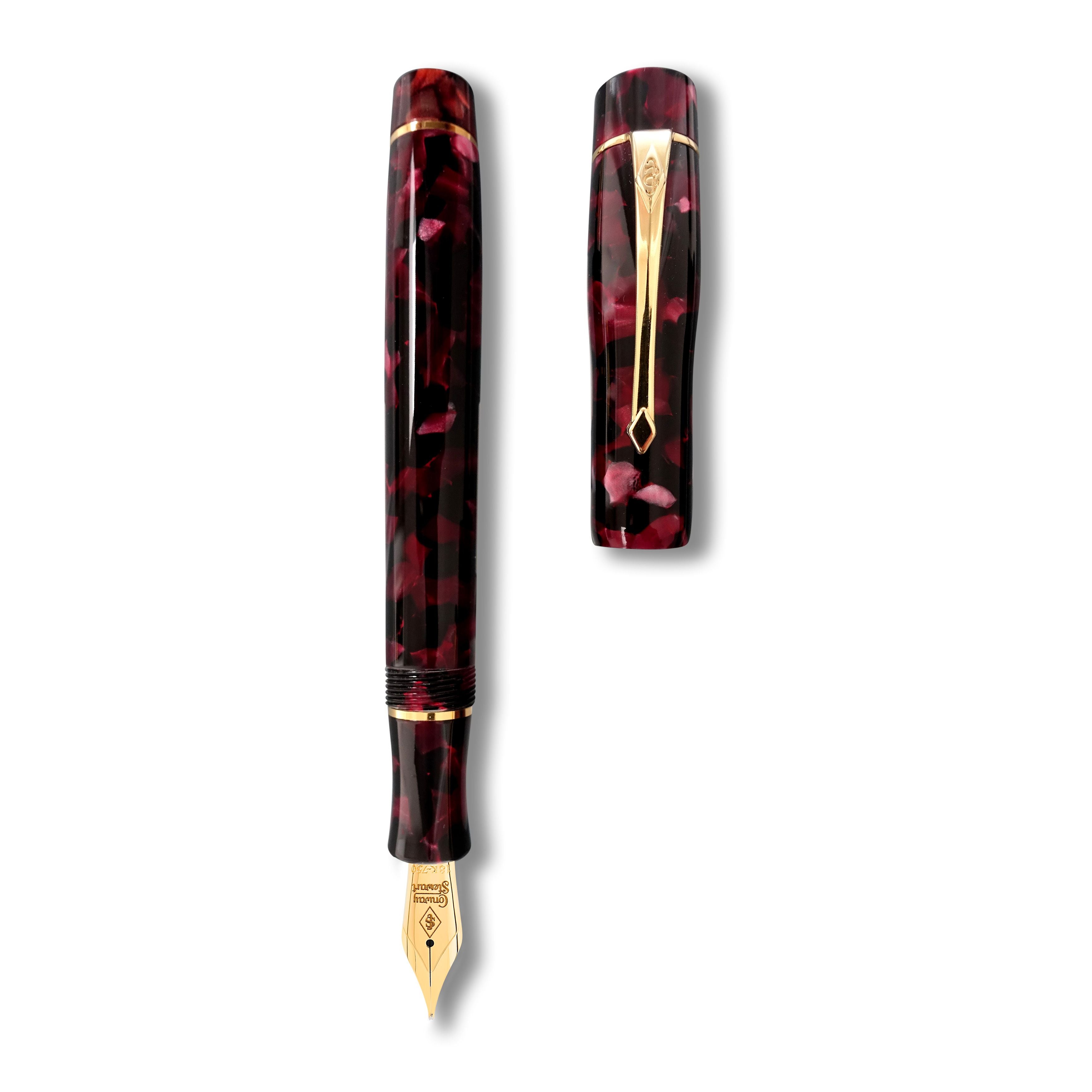 Der Conway Stewart Wellington Classic Claret ist ein wunderschön gestalteter Stift mit einer subtilen und geschwungenen Form, der Komfort bei längerem Gebrauch bietet. Dieser aus exquisitem Classic Claret-Acryl gefertigte Stift strahlt eine klassische und moderne Ausstrahlung aus. Der bordeauxrote Hintergrund, der an edles Bordeaux erinnert, mit schwarzen und perlmuttartigen Formen schafft ein Gesamtbild, das sowohl subtil als auch elegant ist. Jeder Stift ist aufgrund der Komplexität der Farbmischung ein Unikat. Dieser exklusive Stift ist als Füllfederhalter mit einer Auswahl an feinen, mittleren oder breiten Flag-Federn aus 18 Karat Gold erhältlich und wird in einer Präsentationsbox aus schwarzem Conway Stewart-Leder geliefert, die auch als Vitrine für Ihren Schreibtisch dient. Nur 5 dieser Stifte sind verfügbar, was sie zu einem begehrten Sammlerstück macht.
