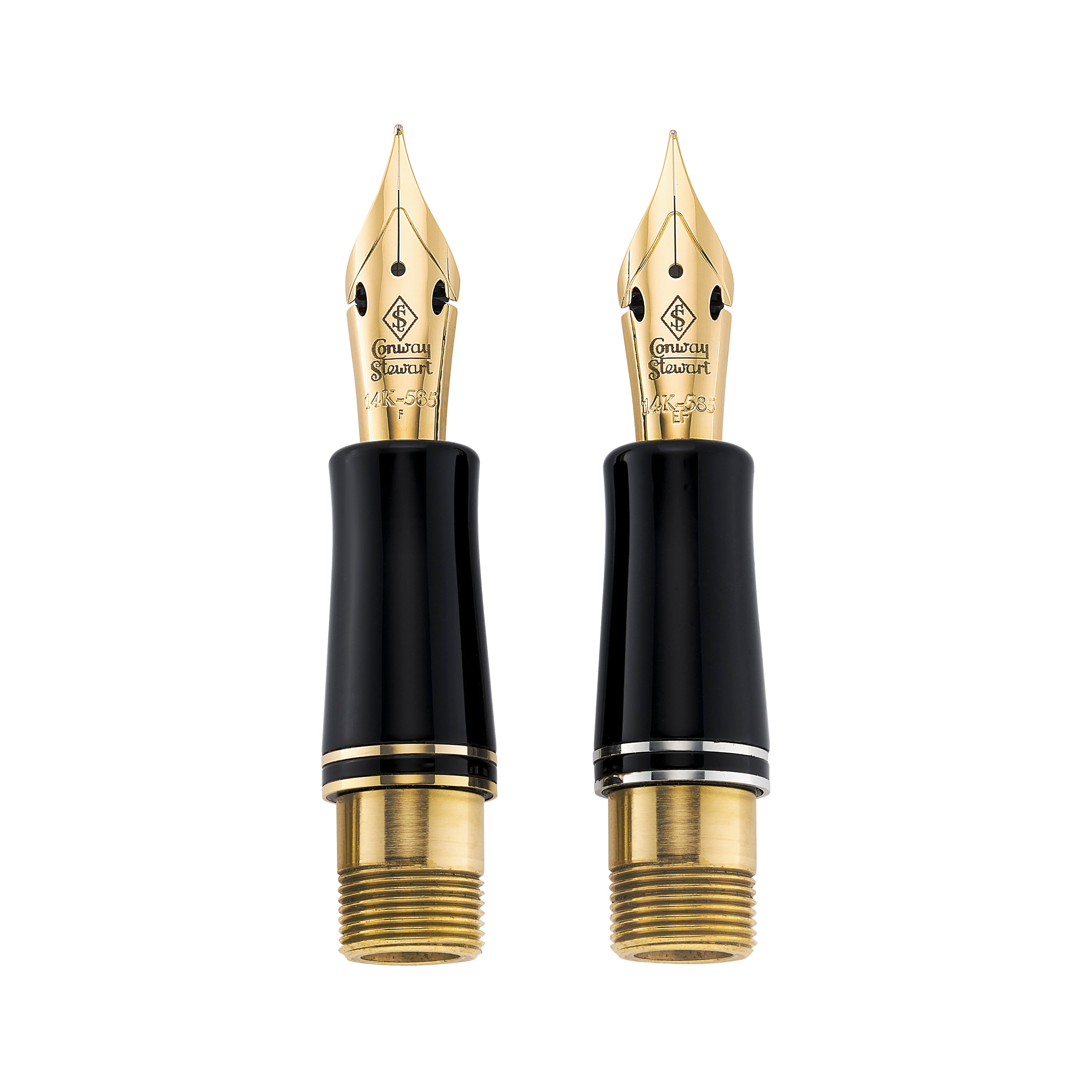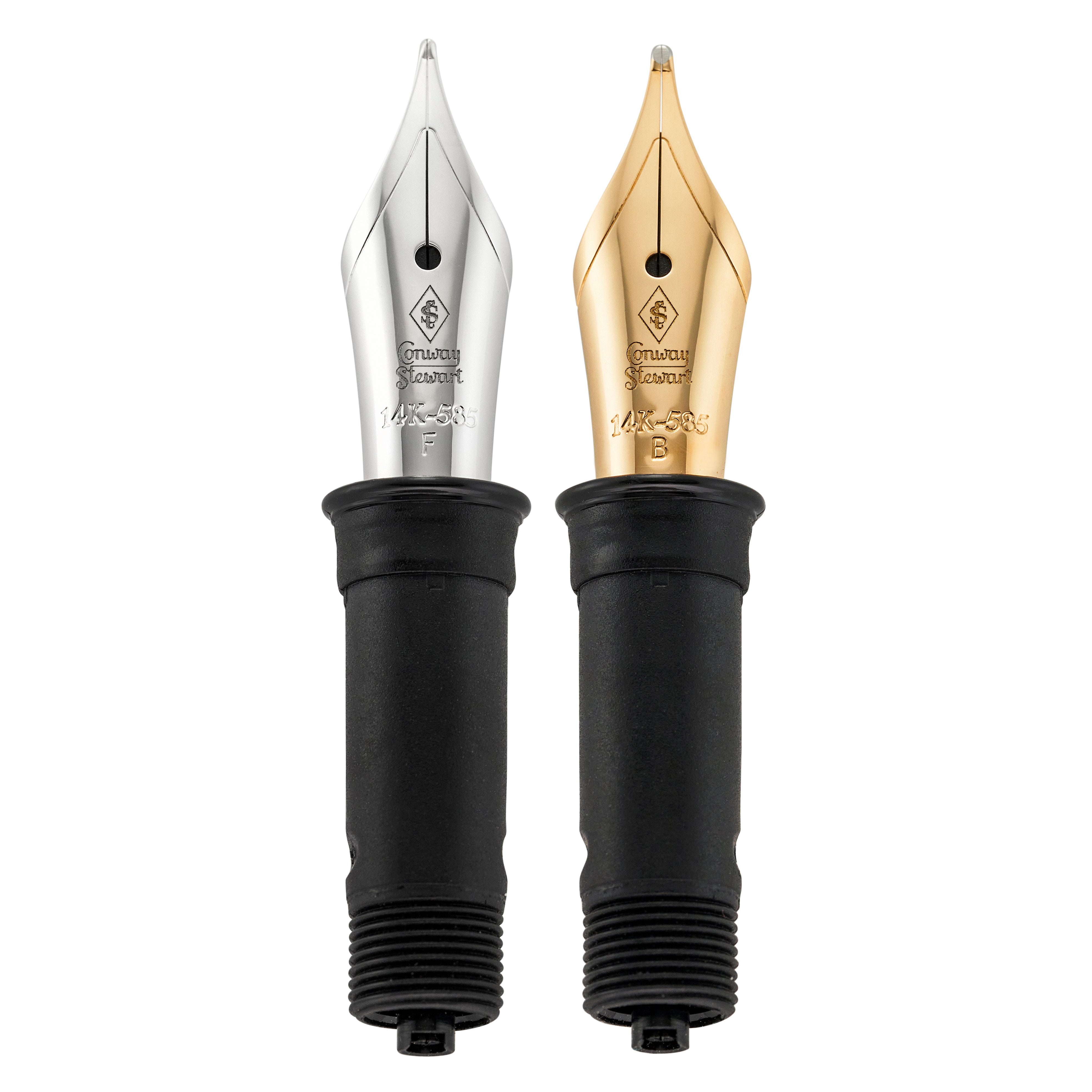 Diese Ersatzfedern und Kalligraphiefedern passen auf die meisten modernen Stifte von Conway Stewart. Sie werden in einem schwarzen Federhalter geliefert, sodass Sie einfach den Schaft Ihres Stifts abschrauben und den neuen Federhalter einschrauben können. Einige Federhalter haben Federringe, sodass in einem Dropdown-Menü abgefragt wird, ob Ihr Stift silberne, goldene oder keine Federringe hat.