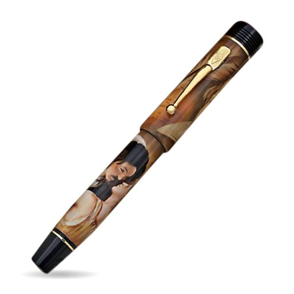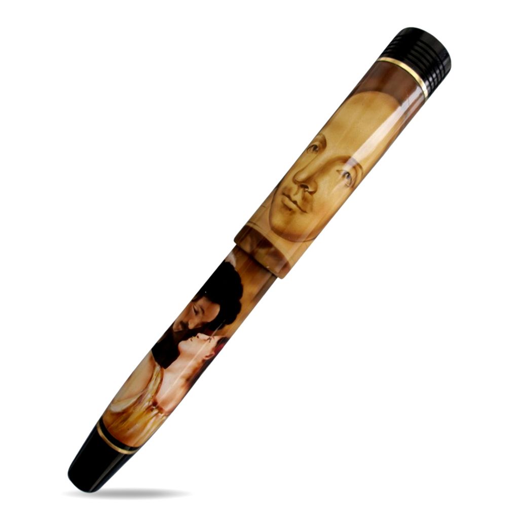 Introducing the Conway Stewart Churchill William Shakespeare hand-painted Edition 21/25, a true masterpiece that pays tribute to England's greatest writer. This rare fountain pen features a breathtaking scene from Romeo and Juliet on the barrel and an engraved likeness of Shakespeare himself on the cap. The artwork is hand-painted by award-winning artist John Dillon GM, making each pen unique. This collector's item is in "as new" condition and comes with a Conway Stewart 18 carat gold Medium nib and cartridge/converter fill. With only one available, this pen is a must-have for any lover of fine writing instruments and Shakespeare enthusiasts alike.