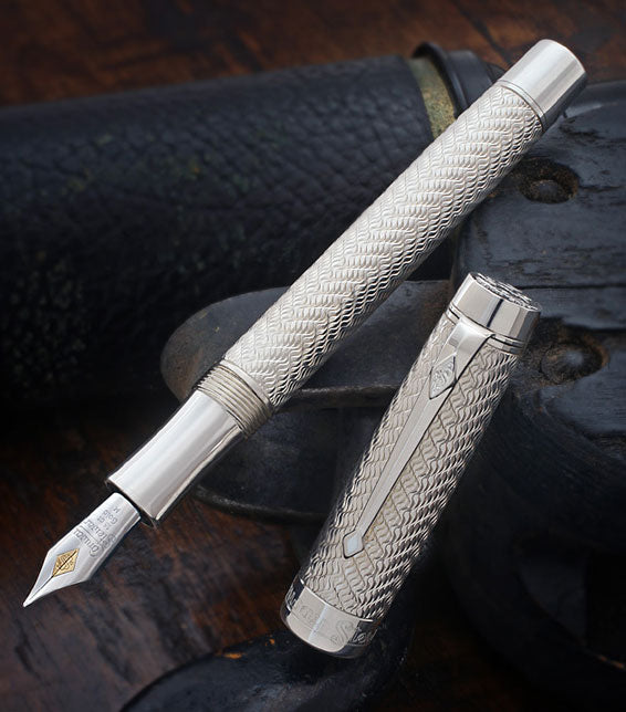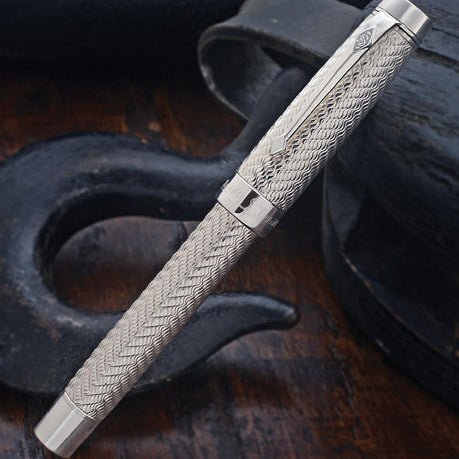 The Drake fountain pen is fashioned from a solid rod of sterling silver. Guilloche engraving is used to create a gently flowing wave pattern on the cap and barrel, set off with highly polished cap top, cap band, and barrel end.