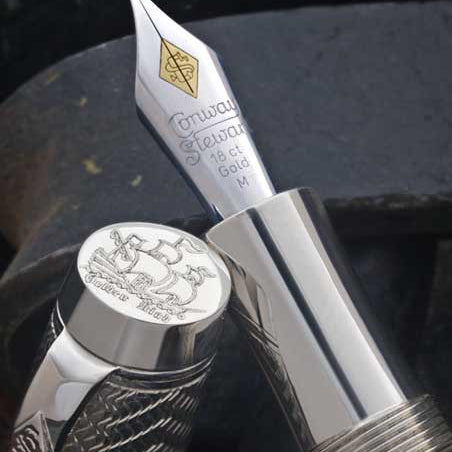 The solid sterling silver section leaves the weight centred low in the hand, ensuring that the pen is balanced well when writing. Each pen is engraved with the name Drake on the cap band, and a likeness of The Golden Hind on the cap top. The Conway Stewart Drake bears the English Sterling Silver Hallmark, the world accepted standard for precious metal.