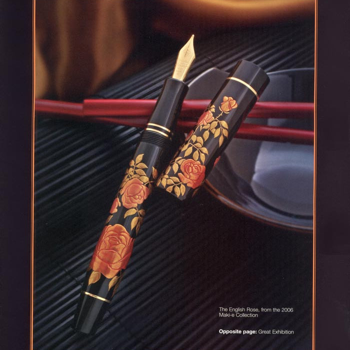 herencia inglesa y, al mismo tiempo, permite la interpretación de un artista japonés", afirma. La nueva pluma estilográfica English Rose, la primera de una serie de cuatro diseños maki-e, logra todo eso y más. Como gerente de producto Para la línea maki-e, Burke aportó trece años de experiencia en diseño y desarrollo de bolígrafos y está satisfecho con los resultados finales: "[Ofrece] una combinación perfecta de Oriente y Occidente", dice.