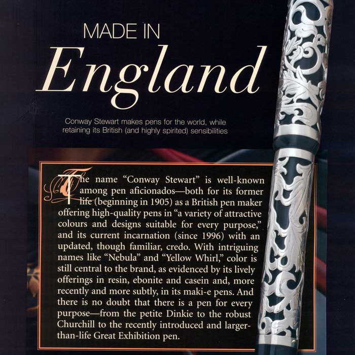 El nombre "Conway Stewart" es muy conocido entre los aficionados a las plumas, tanto por su existencia anterior (que comenzó en 1905) como fabricante de plumas británico que ofrecía plumas de alta calidad en "una variedad de atractivos colores y diseños adecuados para cada propósito", y su encarnación actual (desde 1996) con un credo actualizado, aunque familiar. Con nombres intrigantes como "Nebula" y "Yellow Whirl", el color sigue siendo fundamental para la marca, como lo demuestran sus animadas ofertas en resina, ebonita y caseína y, más recientemente y de manera más sutil, en sus bolígrafos maki-e. Y no hay duda de que hay un bolígrafo para cada propósito, desde el pequeño Dinkie hasta el robusto Churchill y el recientemente presentado y espectacular bolígrafo Great Exhibition.