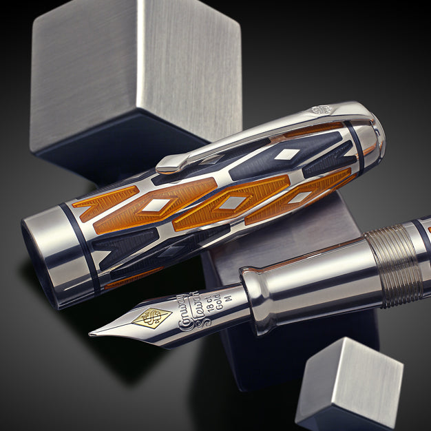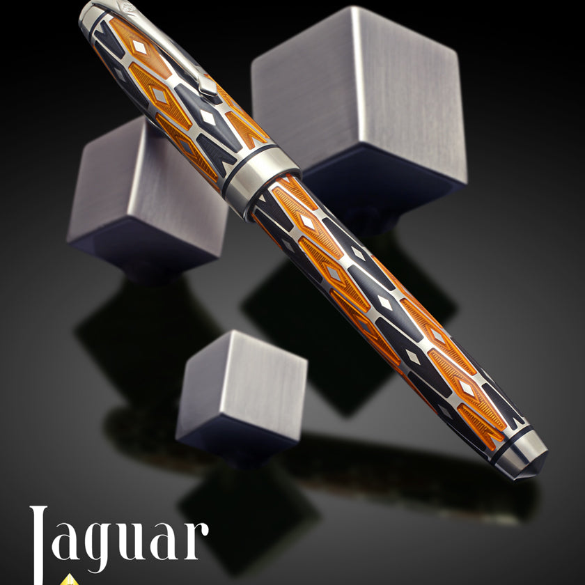 Fabriquée en argent sterling massif, la Jaguar présente une gravure précise dans un motif complexe de diamants abstraits qui rappelle le look classique de la période Art déco. Chaque panneau ornant le capuchon et le corps est rempli d'émail translucide appliqué à la main en orange vif et gris riche. Les motifs de gravure sous-jacents transparaissent, laissant un design à la fois raffiné et élégant, mais également accrocheur sous n'importe quelle lumière. Une attention particulière au design est accordée aux extrémités du capuchon et du corps par le canal gravé et les bandes décoratives en émail gris foncé appliquées à la main.