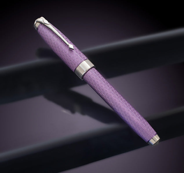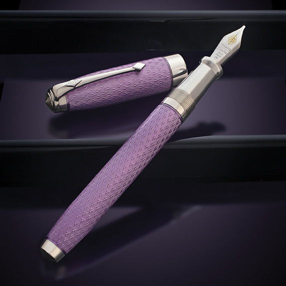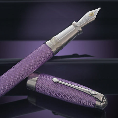 特徴のある純スターリングシルバーで丁寧に作られたエリザベス ギャレット アンダーソン ペンは、ファベルジェのスタイルでデザインされており、キャップとボディには非常に詳細なギヨシェ フォックスヘッド パターンが刻まれています。繊細なラベンダーの色合いの鮮やかな接着エナメルで巧みにカバーされています。この絶妙なペンは、モダンなデザインのクラシックになるために必要なすべての特性を示しています。