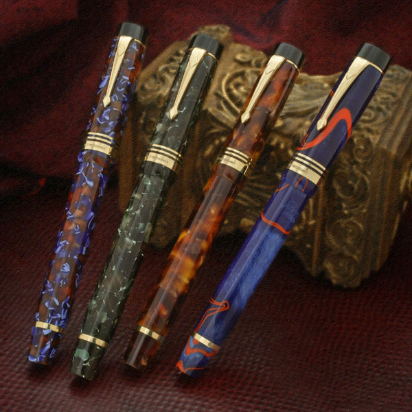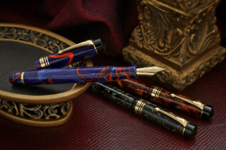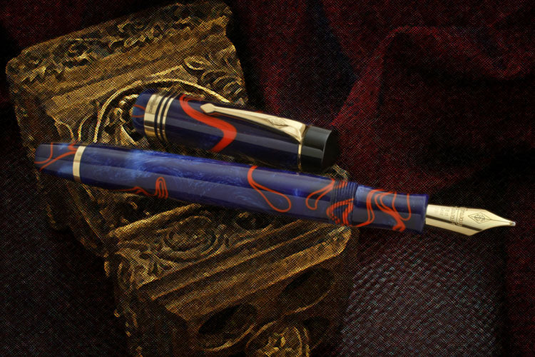 ネルソン限定の新色は、きらめく深いブルーと強烈なレッドの渦巻きを組み合わせたクリムゾン ワールです。そして、それは素晴らしいです!この樹脂の青い成分は、ペンに本当の深みときらめきを与える小さなきらめく要素が埋め込まれているため、特に興味深い.