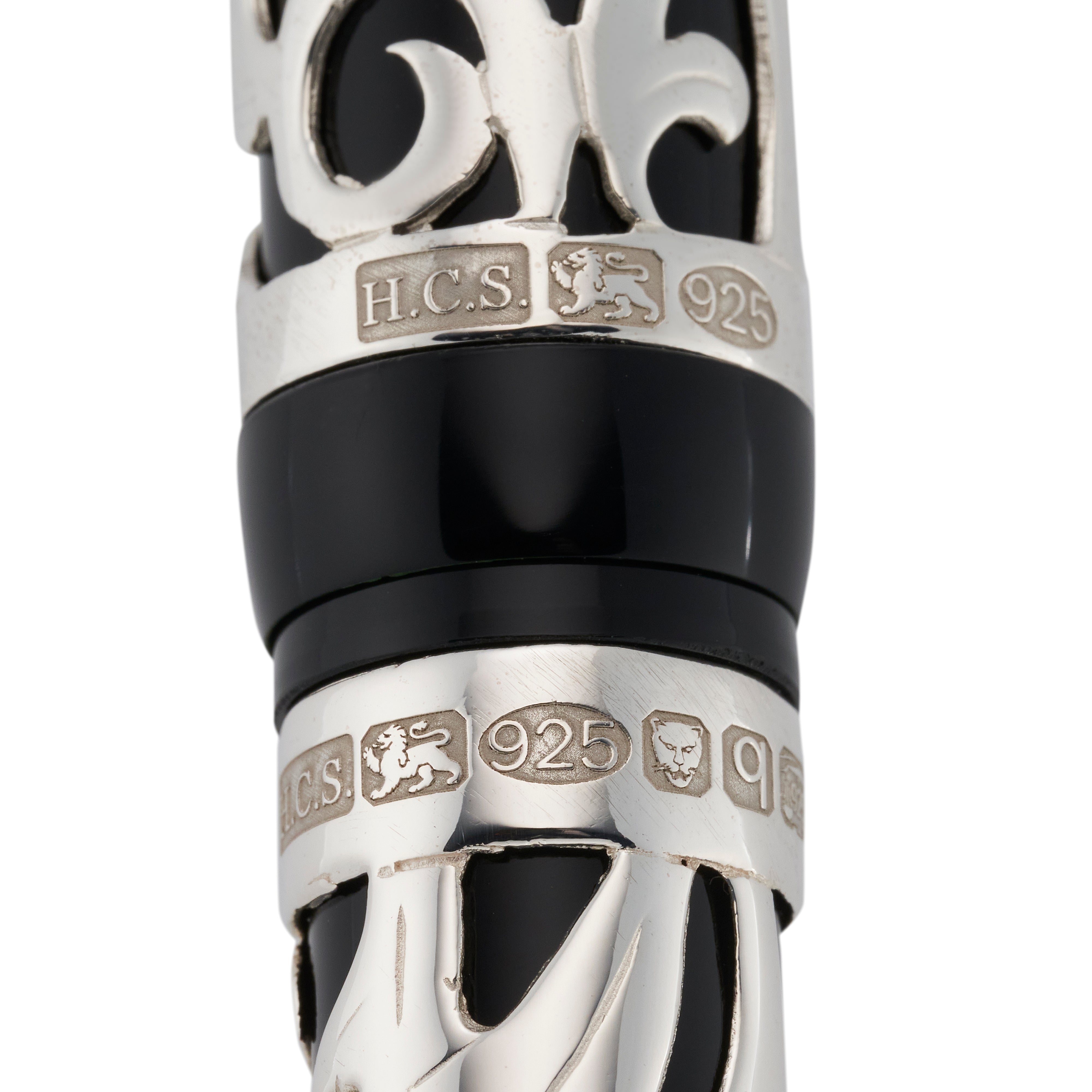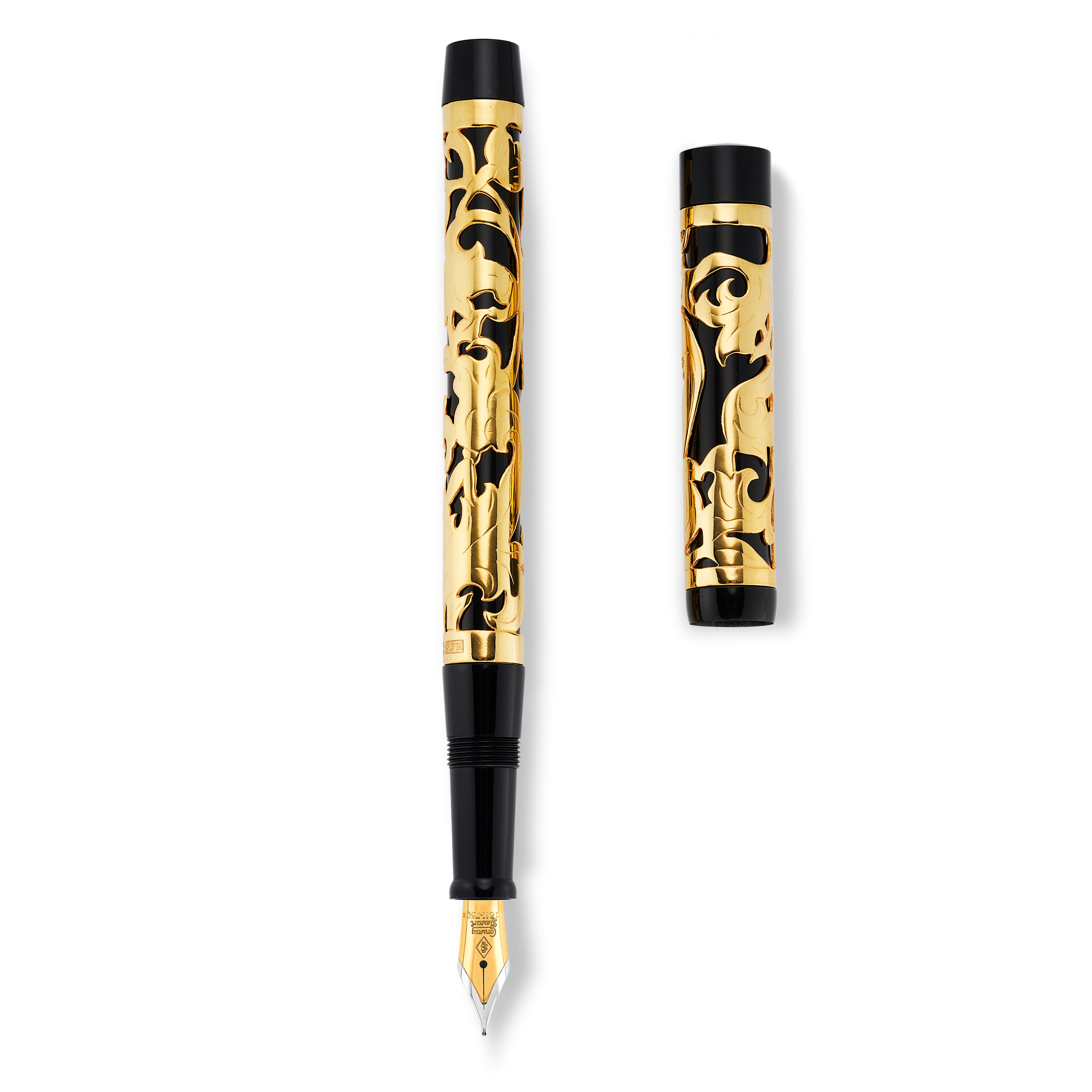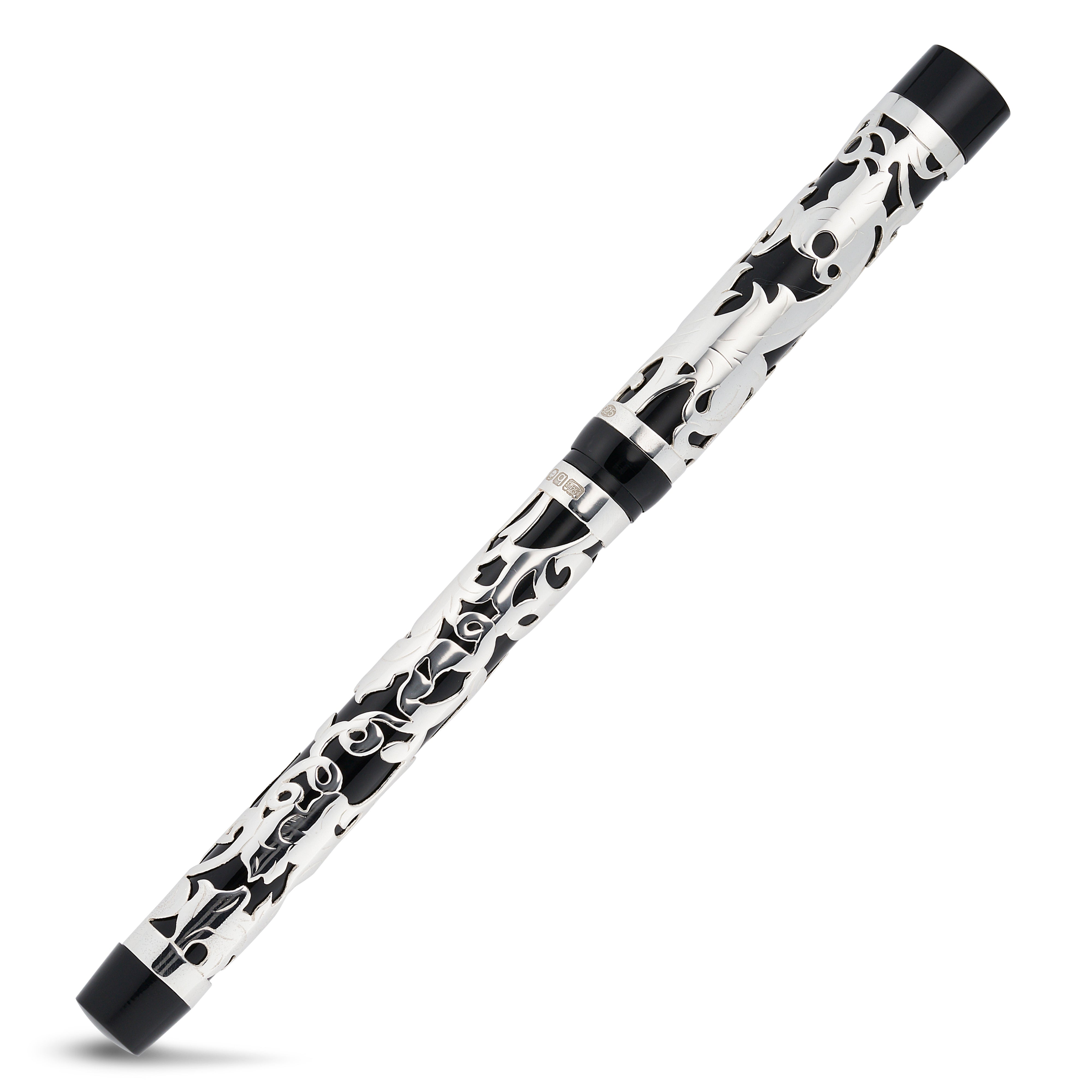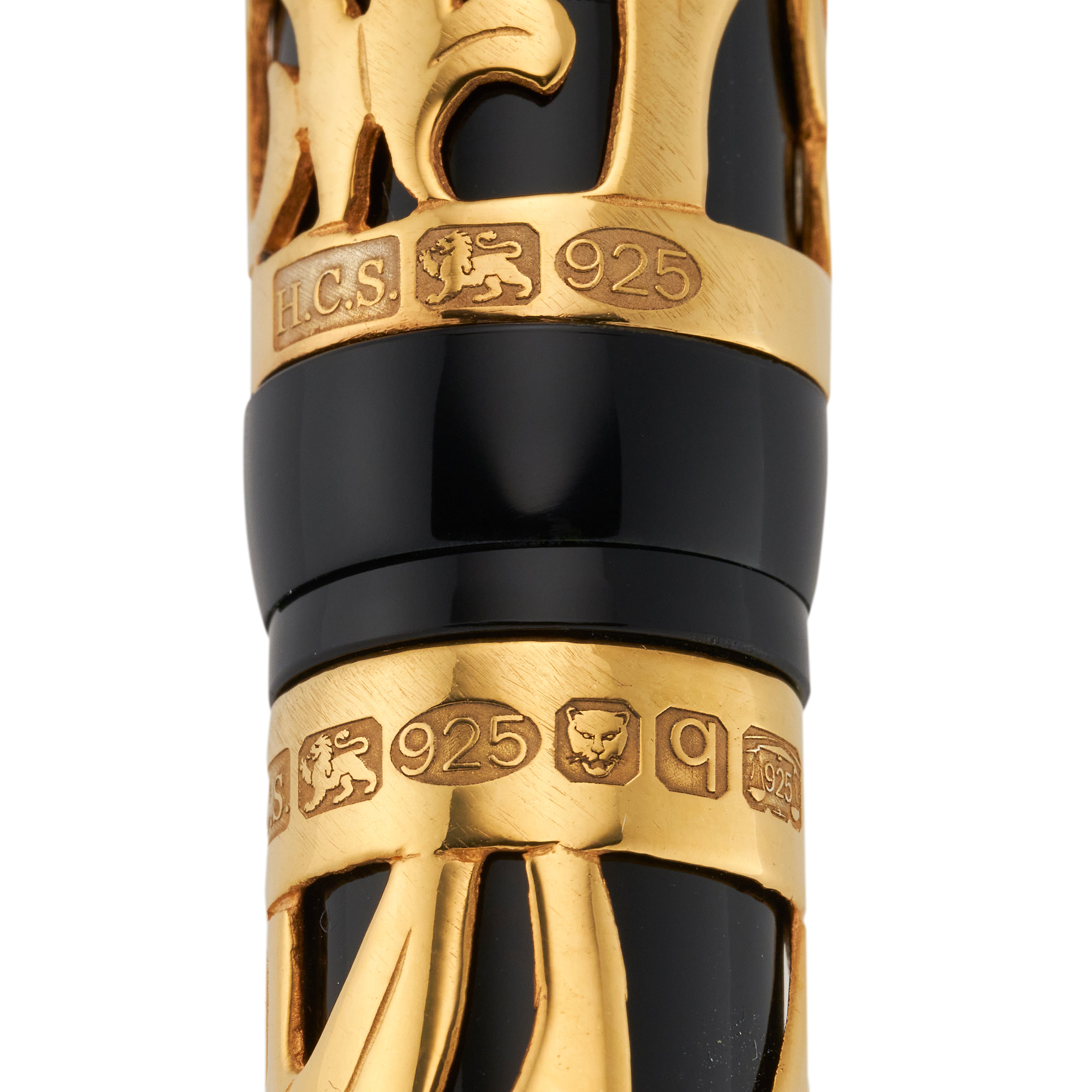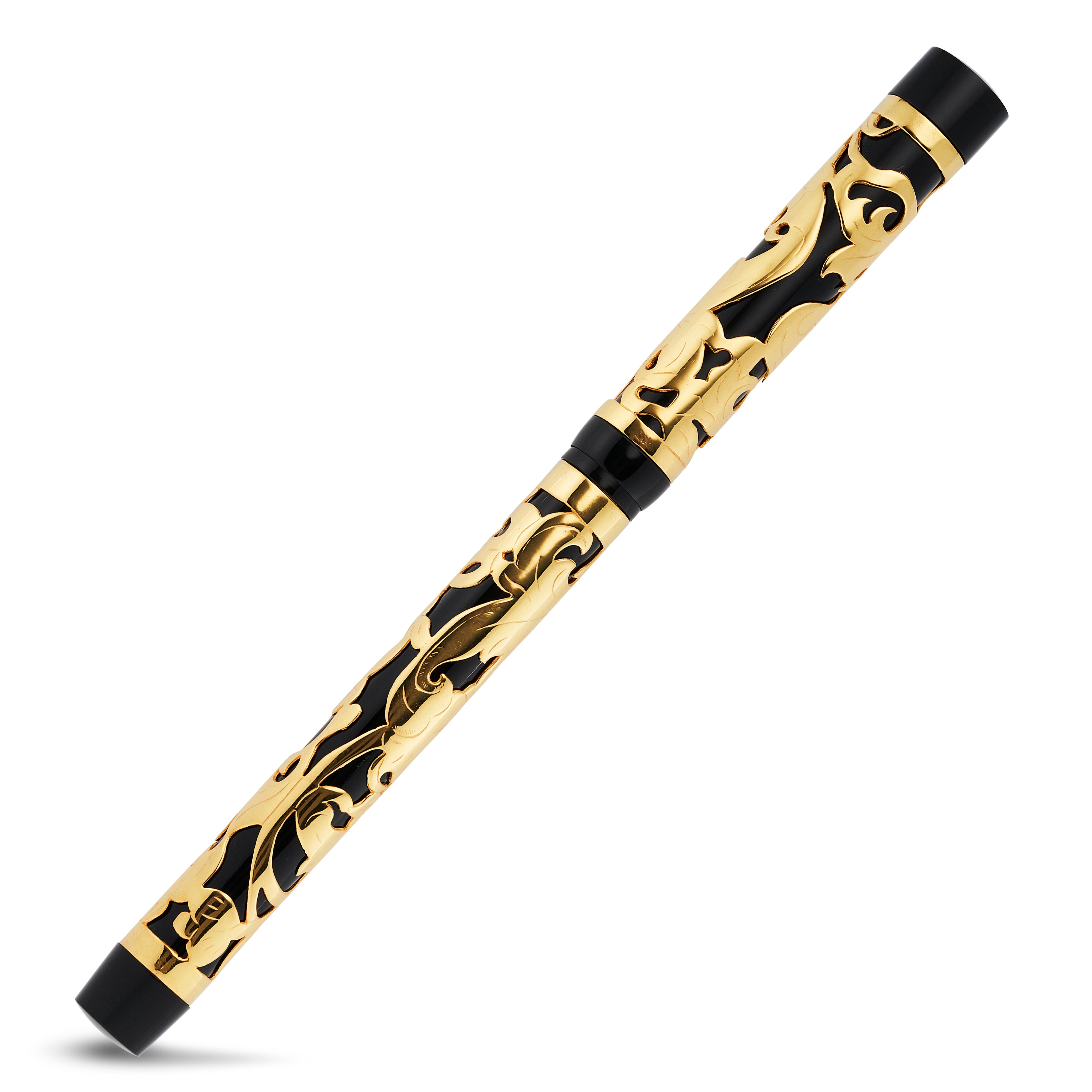 キャップとバレルの各オーバーレイは貴金属の平らなシートから始まり、フィリグリーの各部分は手作業で丹念に穴を開けられます。次に、シートは鋼鉄のマンドリル上で円筒形に成形され、アカンサスの葉の模様が各ピースにフリーハンドで彫刻されます。これは、ヘンリーによって何時間もの労働を要した高度な技術を要するプロセスです。